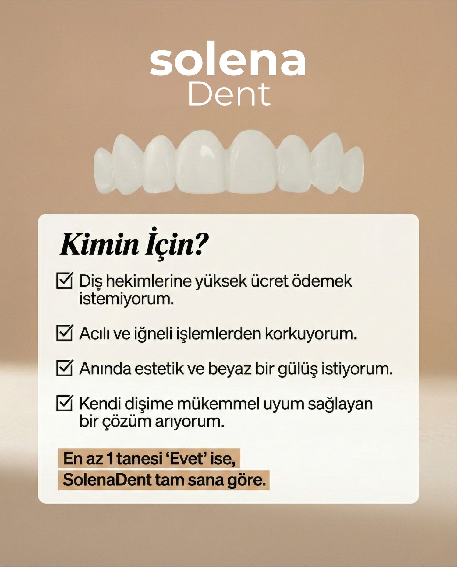 "Diş hekiminden aldığım kaplama fiyatları bütçemi çok aşıyordu. Denemek için Solenadent aldım ve sonuçtan aşırı memnunum. Hem acısız hem de binlerce lira harcamadan bembeyaz bir gülüşe sahip oldum. Kullanımı çok pratik, gün boyu rahatsız etmiyor. Kesinlikle tavsiye ederim."